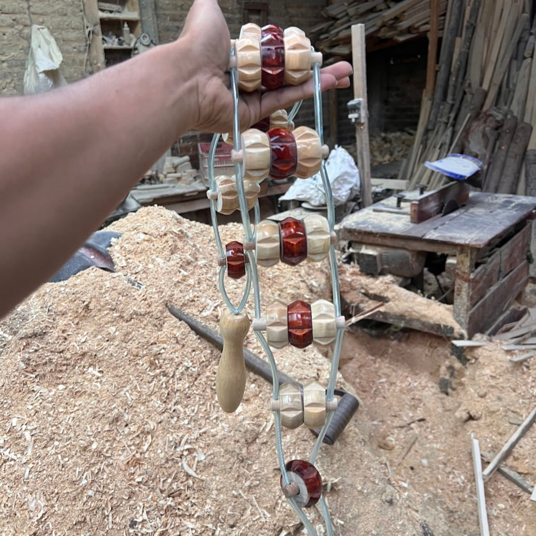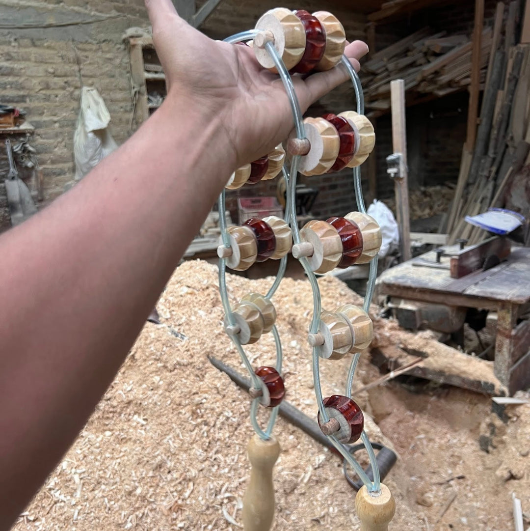 Fabricado con rodillos de pino pátula secado lentamente para máxima durabilidad, ensamblados en un cordón de acero recubierto que no se deforma y rematado con mangos ergonómicos de madera pulida que garantizan un agarre cómodo. Ligero, fácil de limpiar y perfecto para uso profesional o para incorporar un masaje revitalizante a tu rutina diaria en casa.